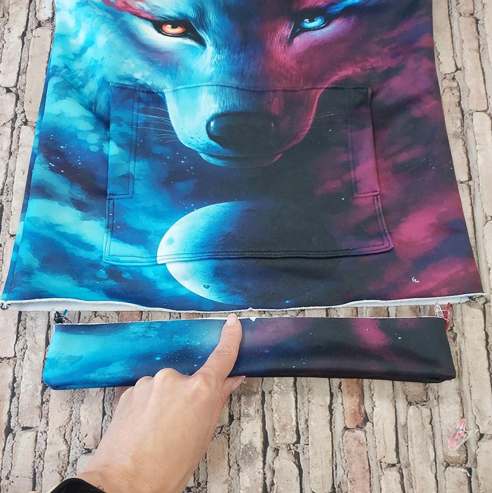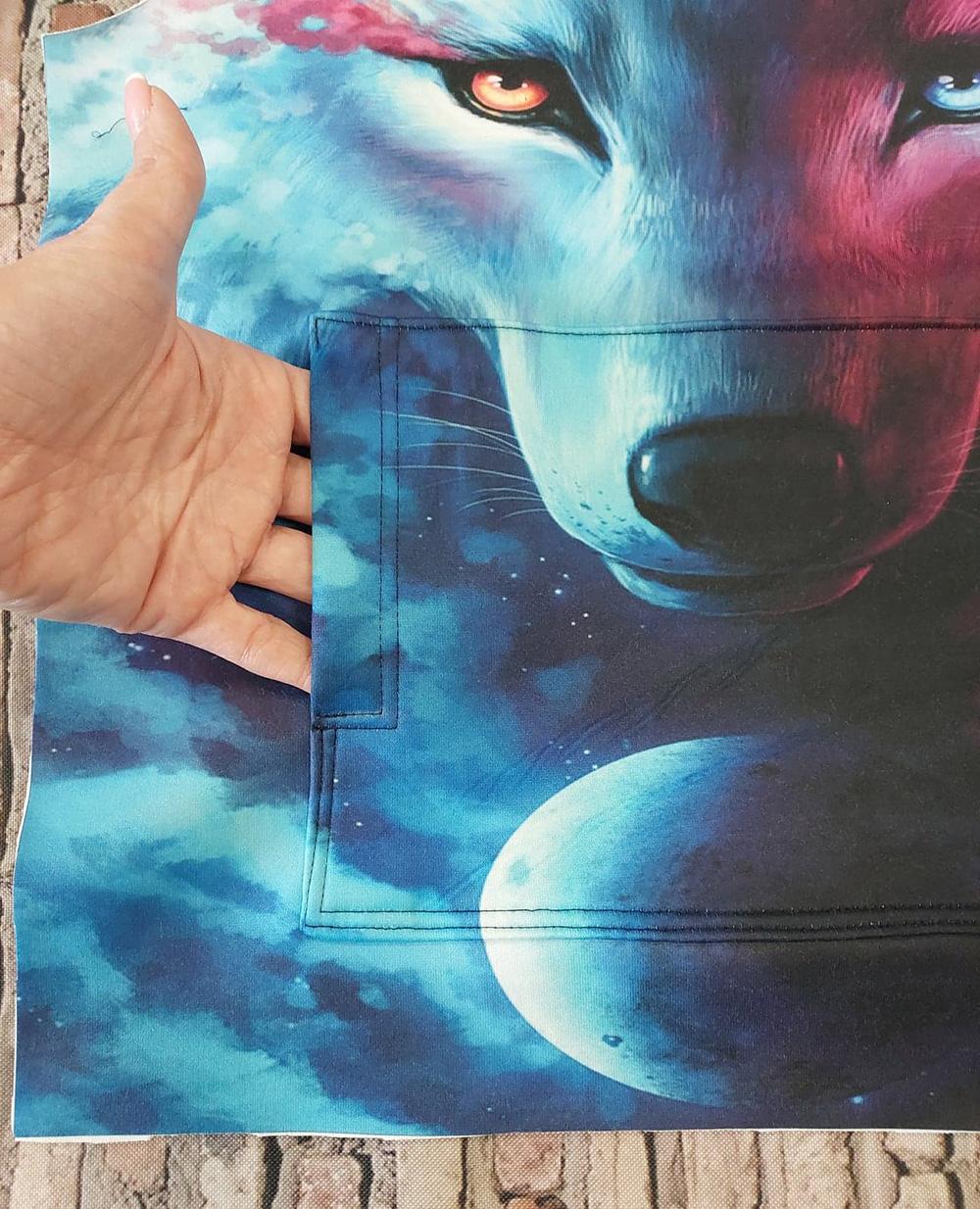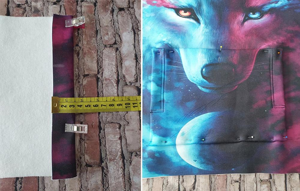Rozpocznij od wszycia kieszeni. Kieszeń zawiń na krótszych bokach 3 cm pod spód i ozdobnie wystębnuj miejsca wkładania rąk. Na ten cel przeznacz około 13 cm. Następnie przyszyj kieszeń do przodu bluzy tak, aby wzór nadruku się zgadzał.