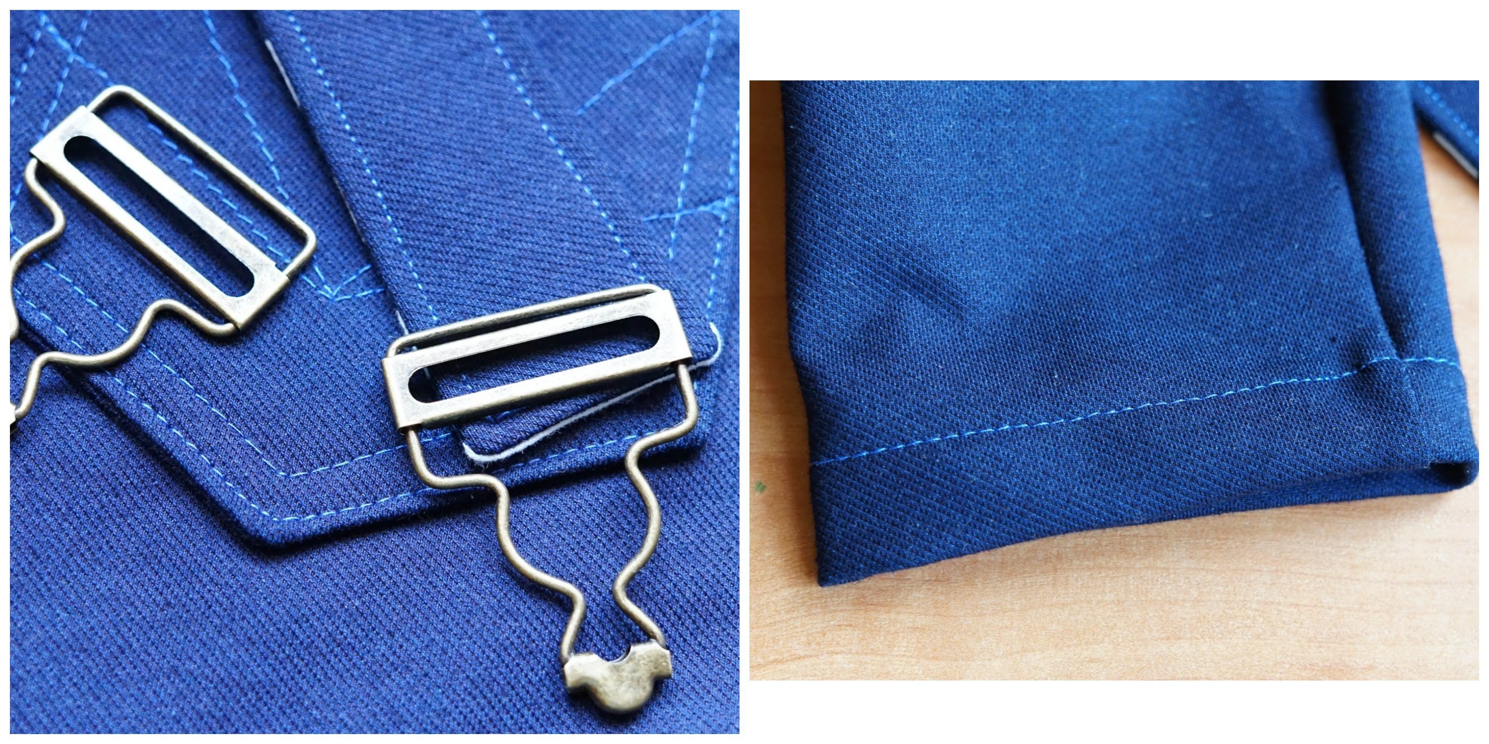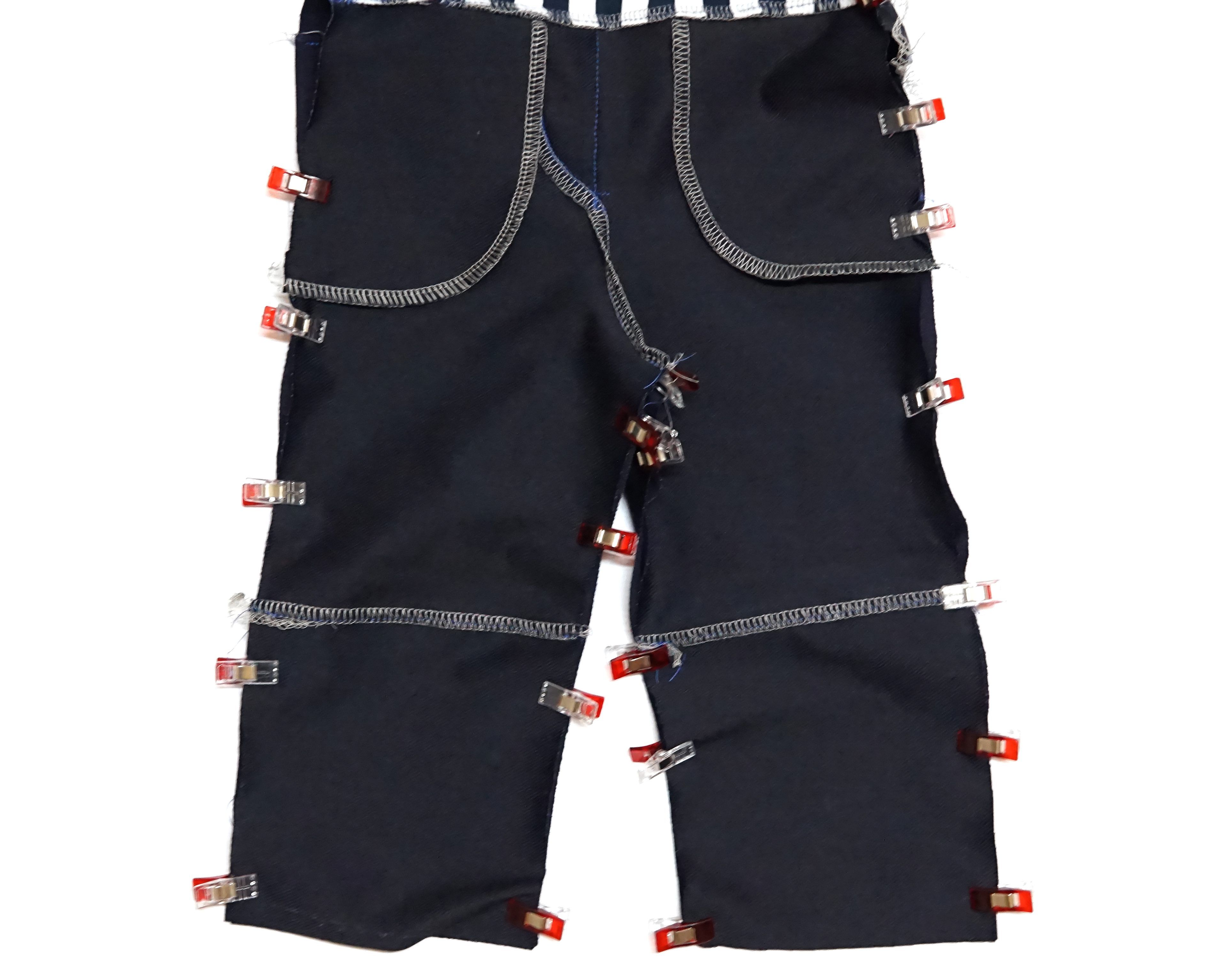 Pozostało nam tylko zszycie obu części (przód i tył) ogrodniczek ze sobą. Spinamy nogawki po zewnętrznej stornie oraz w kroku i zszywamy. Jeśli chcemy, można w tej chwili wciągnąć w pasek z tyłu gumkę. Jej brzegi wszyjemy zszywając zewnętrzną stronę nogawek.