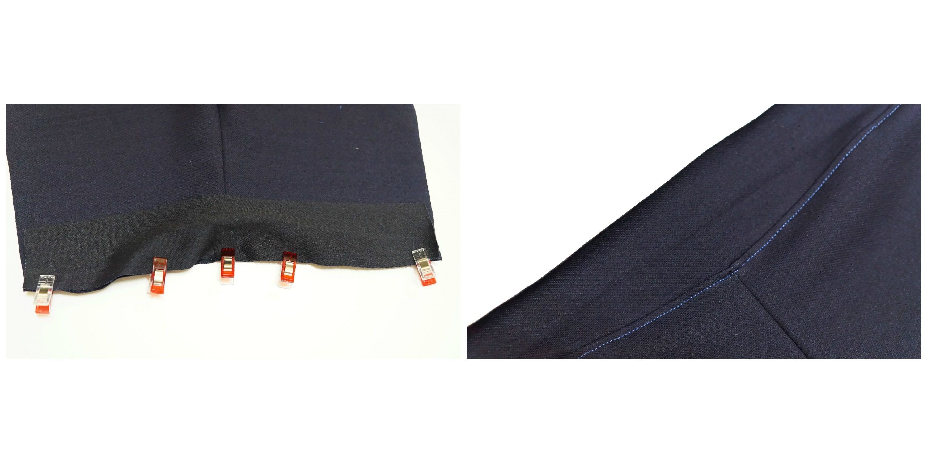 Na zdjęciach poniżej podzielona nogawka tylna (zapasy na szwy na niebiesko) oraz dorysowany do nogawki przedniej udawany rozporek