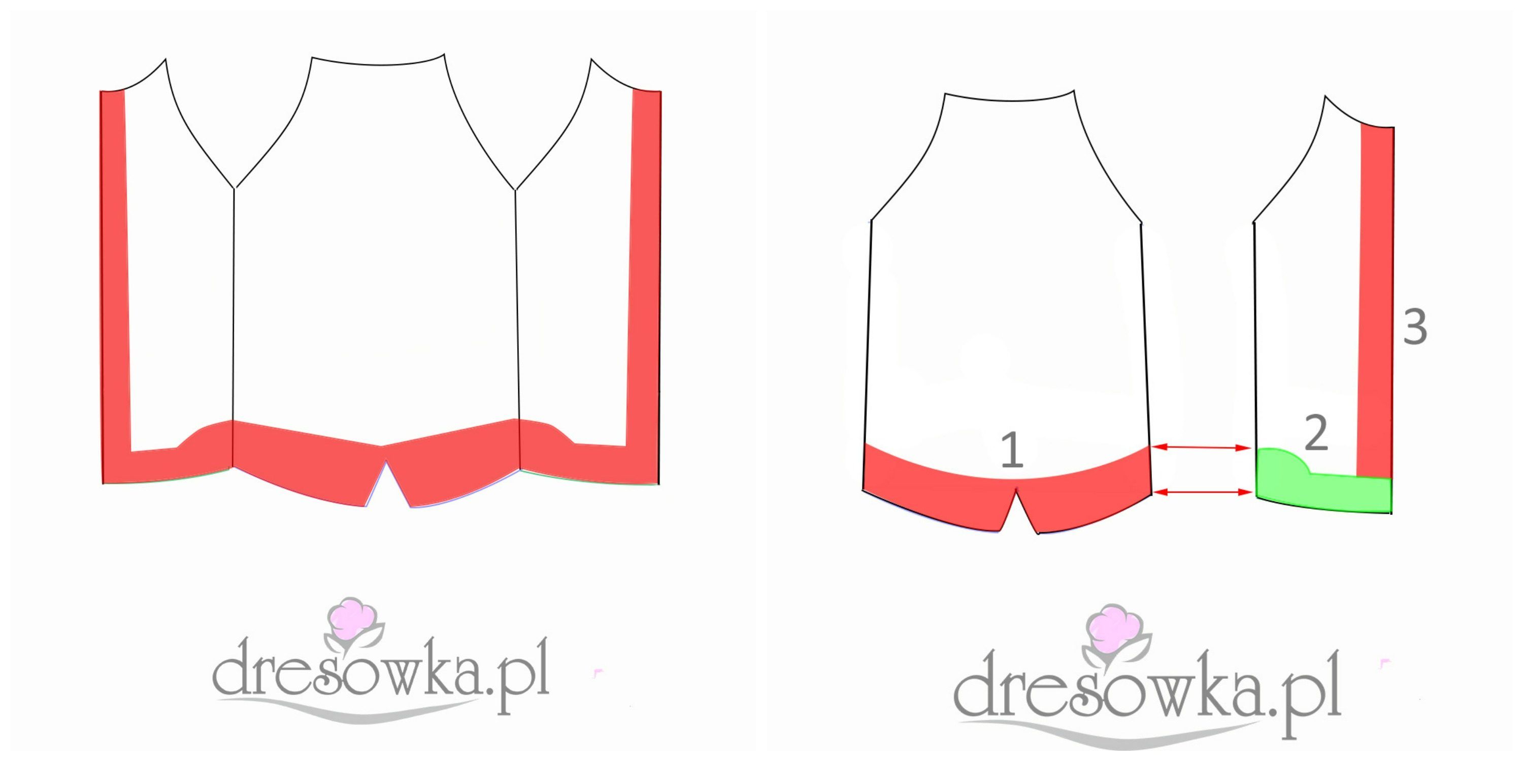 Wykrój musimy oczywiście zmodyfikować. Wydłużamy tył i robimy w nim charakterystyczne rozcięcie . Przód również wydłużamy, możemy lekko zaokrąglić. Przód oraz tył trochę rozszerzamy ku dołowi. Tył wydłużamy o około 10 do nawet 15 cm. Przód wydłużamy, o tyle, aby był zogdny z tyłem w miejscu zaznaczonym strzałką.