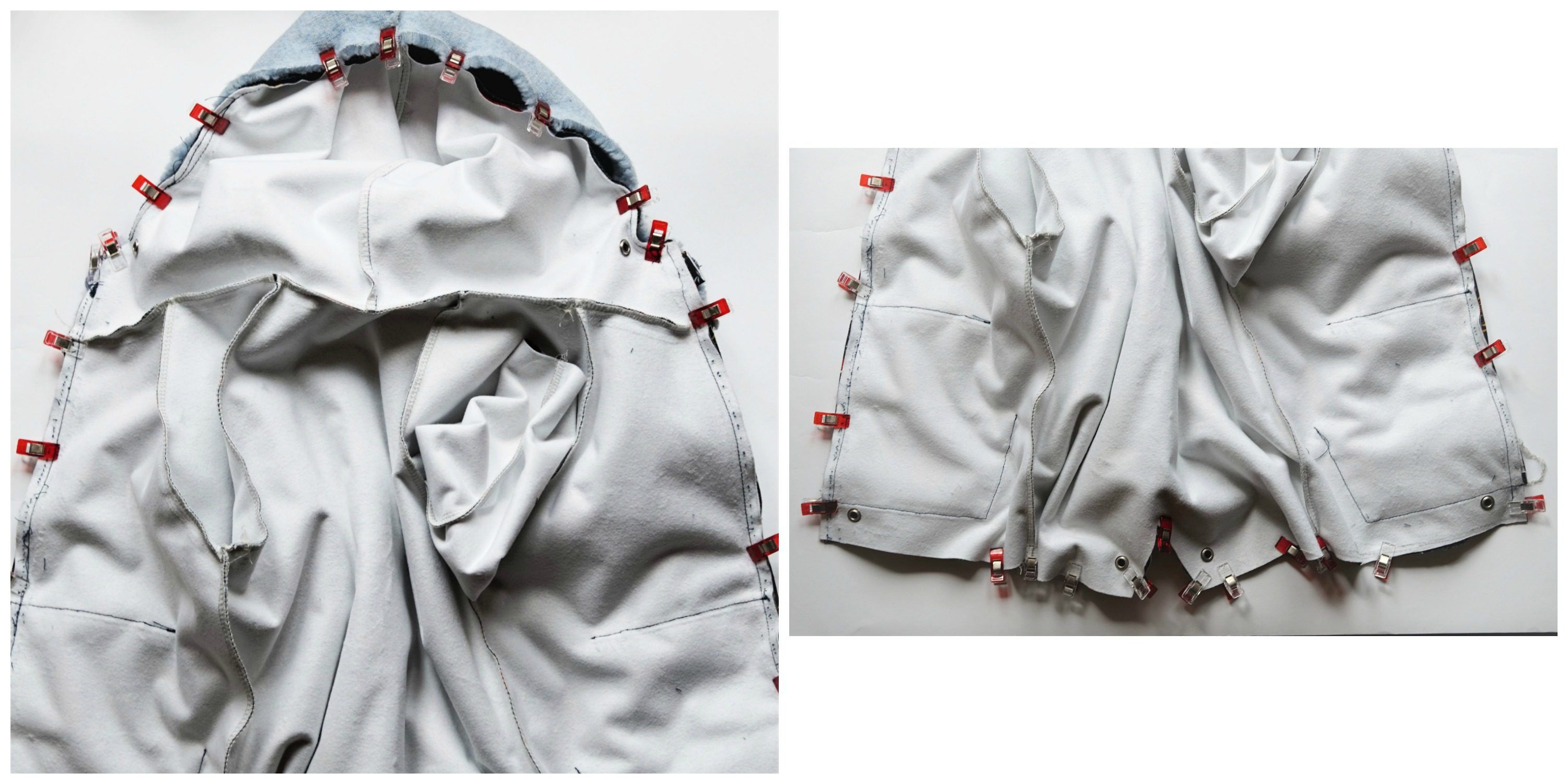 Czas na połączenie obu oddzielnych "kurtek" w jedną. Układamy obie kurtki prawymi stronami do środka i spinamy . Przeszywamy całość naokoło na maszynie wieloczynnościowej.