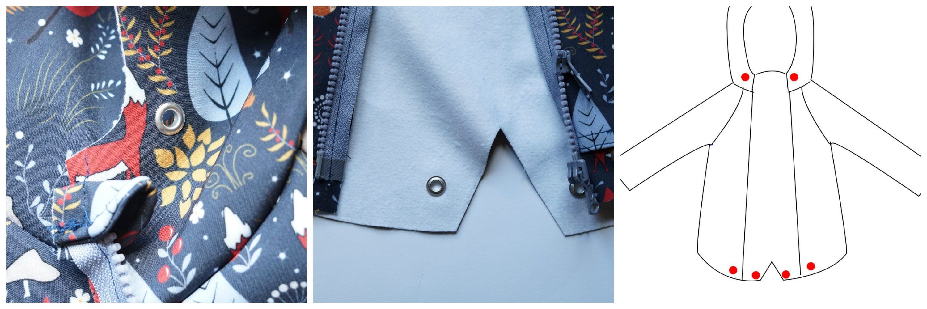 Nabijamy oczka kaletnicze przy kapturze, przy rozcięciu i z przodu na dole przy zamku* (nabijamy je odpowiednio dalej od brzegu, bo kurteczka będzie jeszcze łączona z podszewką) :