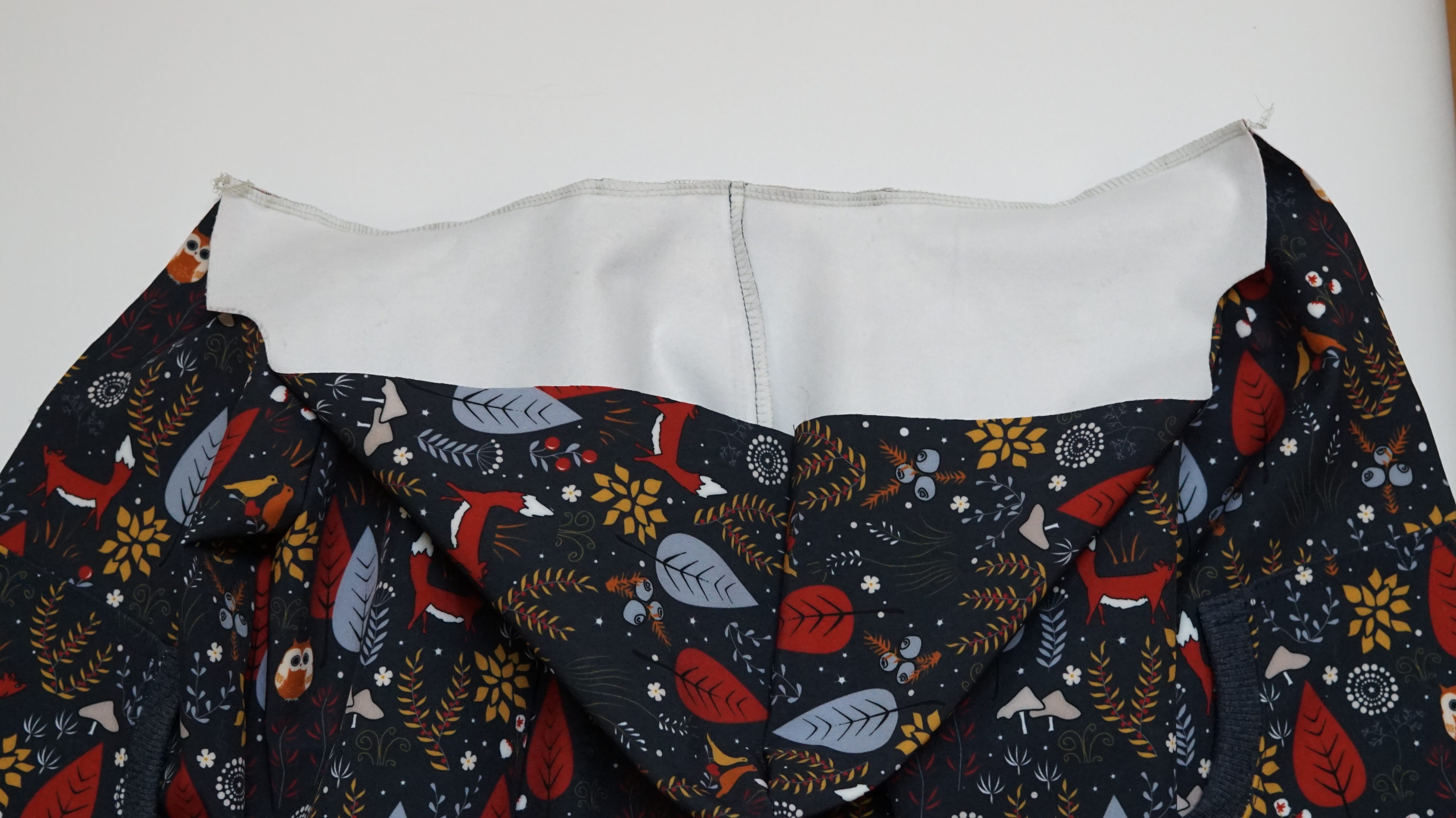 Do wlotów kieszonek przyszywamy paski ze ściągacza prążkowanego i stębnujemy blisko miejsca wszycia na prawej stronie. Osłonkę przygotowujemy z dwóch półkoli (jak ja dokładnie przygotować pokazywałam już w tym tutorialu na lekką kurteczkę z softshellu <KLIK>: