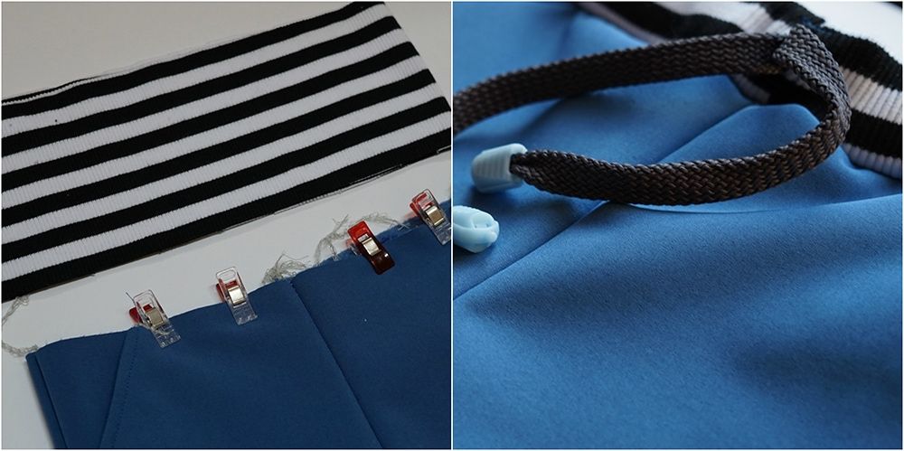 Kolejna czynność to wszycie ściągacza w pasie. Ja dodałam również i do niego otwór na sznurek przygotowany tą samą metodą co wcześniejsze otwory: