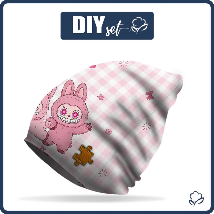 W zestawie znajdują się materiały niezbędne do uszycia czapki.