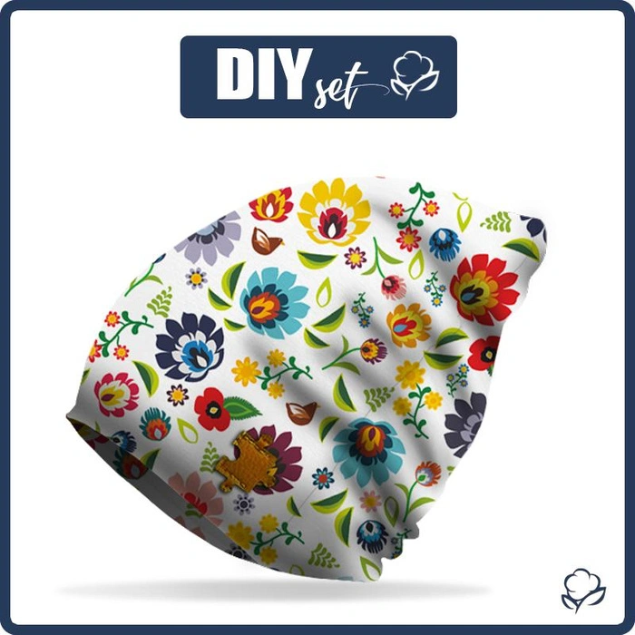 W zestawie znajdują się materiały niezbędne do uszycia czapki.
