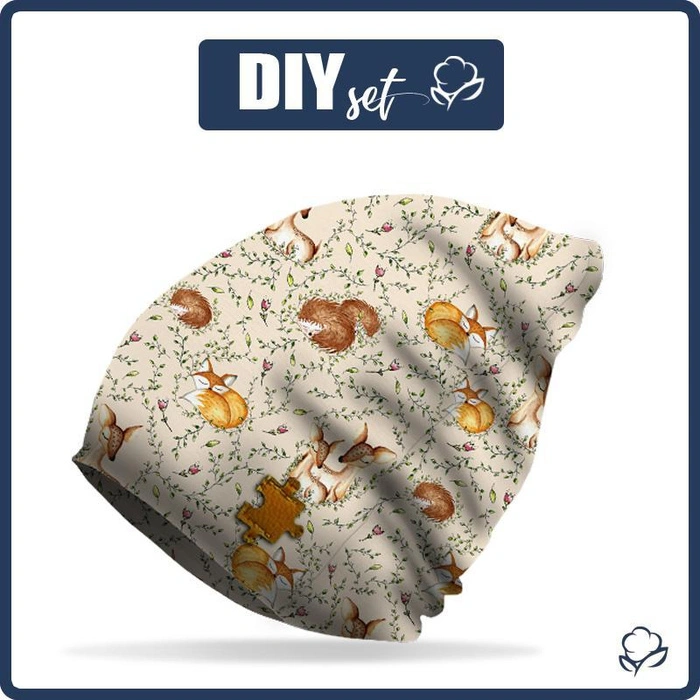 W zestawie znajdują się materiały niezbędne do uszycia czapki.