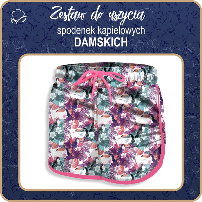 V sadě najdete materiály nutné k šití dámských koupací šortek. Všechný prvky jsou zabalené v papírovou krabici