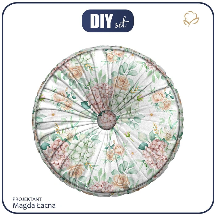 Sada DIY obsahuje materiály potřebné k ušití kulatého dekorativního polštáře. Všechny prvky jsou baleny v kartonové krabici. Velurový panel obsahuje: 1x přední strana polštáře, 2x zadní strana polštáře, 2x lem na zip, 2x ozdobný lem, 1x obvodový lem.