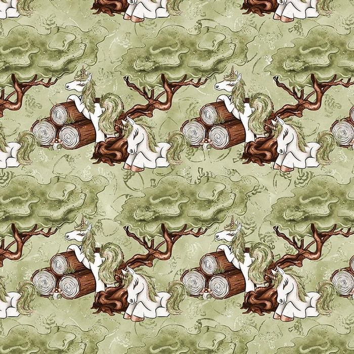 Materiál k šití s tištěným vzorem LESNÍ JEDNOROŽCI VZ. 2 / zelený.