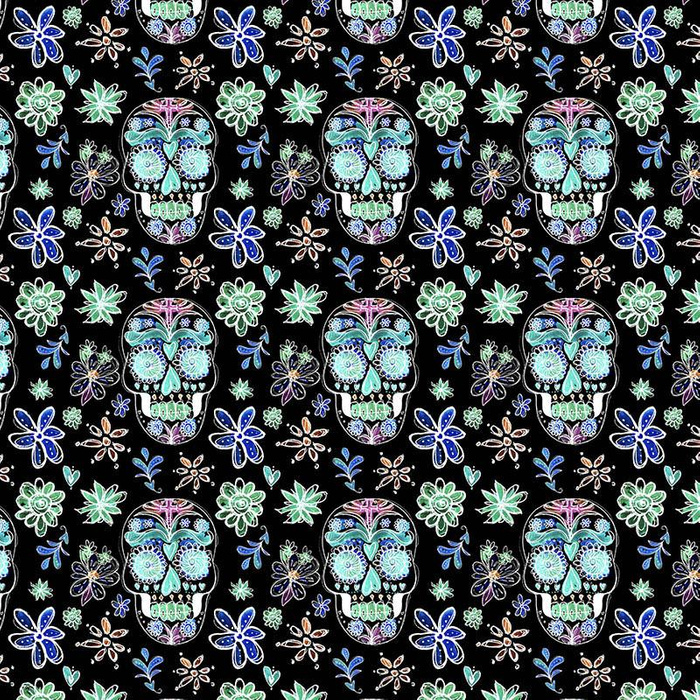 Materiál k šití s tištěným vzorem NEONOVÉ LEBKY vz. 2 (DIA DE LOS MUERTOS)