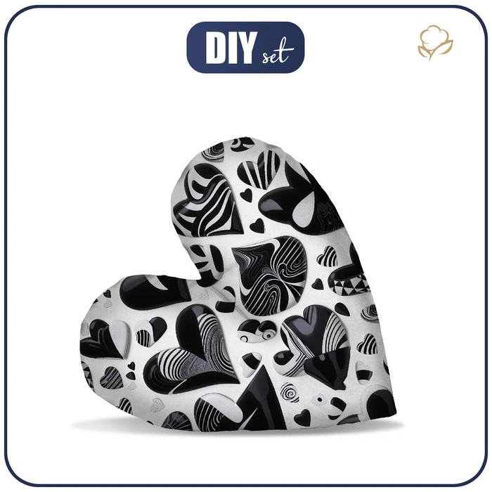 V sadě najdete materiály nutné k šití dekorační polštáři ve tvaru srdce.