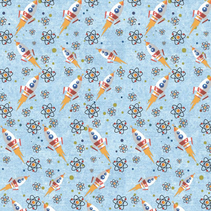 Materiál k šití s tištěným vzorem RAKETY (CESTA DO VESMÍRU) / ACID WASH AZUROVÝ