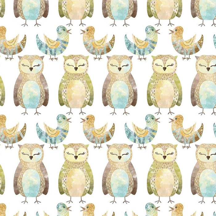 Materiál k šití s tištěným vzorem SOVY A PTÁCI (LESNÍ ZVÍŘATA).