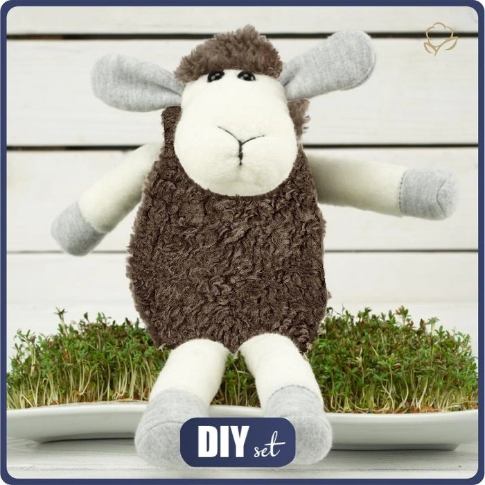 V sadě najdete materiály nutné k šití maskot ovce. Všechny prvky jsou zabalené v papírové krabici.