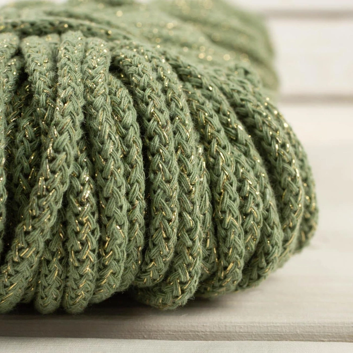 Baumwollkordel mit Acrylkern (Farbe sehr ähnlich der Farbe des Baumwollgeflechts) mit Metallic-Faden in Farbe Gold. Hauptsächlich für Bastelarbeiten (Makramee, Untersetzer, Baumwoll- Teppiche, verschiedene Arten von Fensterdekorationen) geeignet, aber auch für Kleidung und verschiedene Textilien bestimmt.
