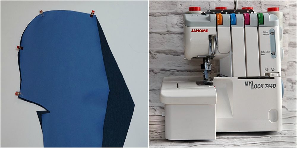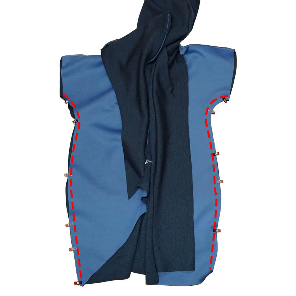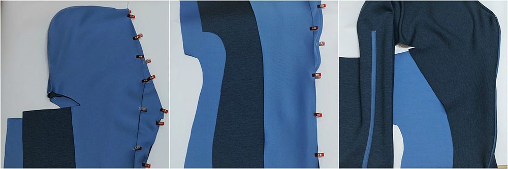 Zszyte na kapturze obłożenie spinamy ze zszytymi wcześniej częściami przodu płaszcza. Obłożenie i warstwę wierzchnią układamy prawymi stronami do siebie, spinamy i zszywamy na całej długości brzegu: