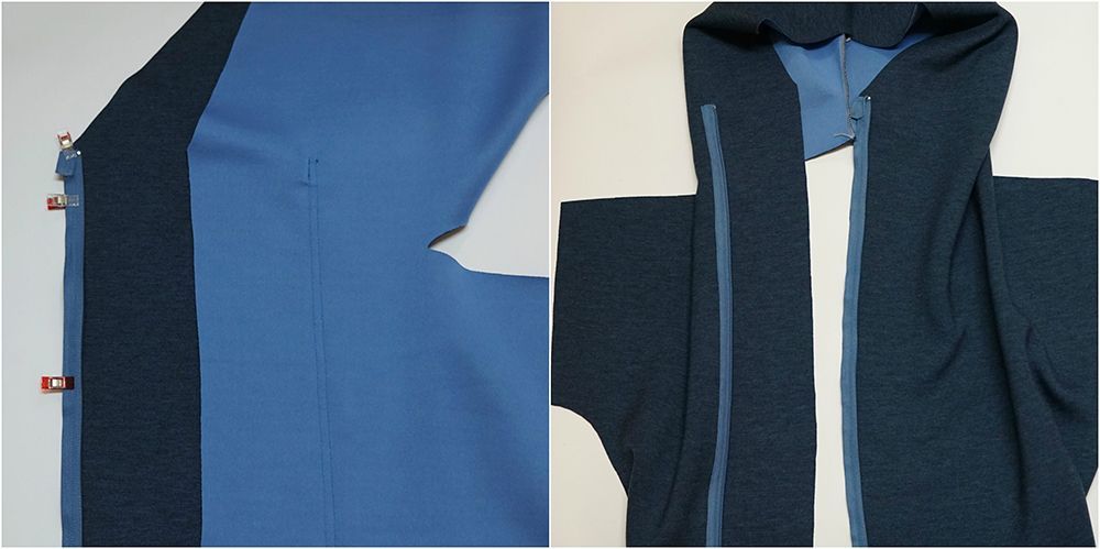 Teraz zszywamy przód płaszcza z wszytym już obłożeniem z tyłem płaszcza .