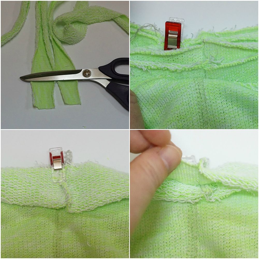 Aby wykończyć w ten sposób dekolt, w ubraniach szytych z dzianin należy przygotować dwie pliski dekoltu (tutaj z materiału FLUO aby podkreślić charakterystyczną petelkę od spodu dzianiny), które będą odpowiednio którsze od obwodu dekoltu.