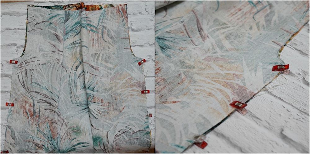 Następnie oba prostokąty układamy jeden na drugim prawymi stronami do środka i zszywamy po bokach.