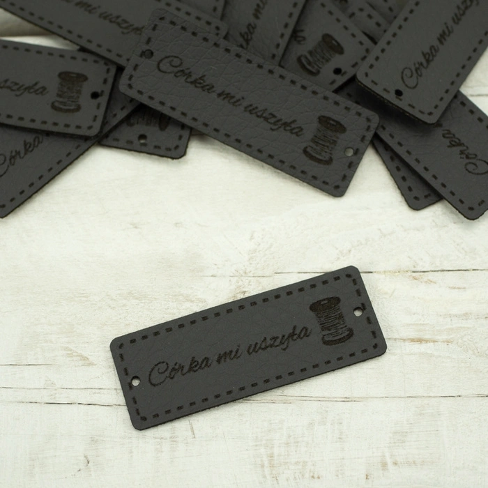 Eiförmige Applikation aus Öko-Leder mit dem Aufschrift "Córka mi uszyła".
