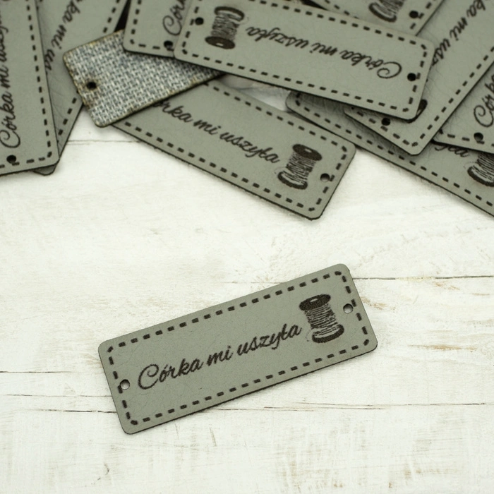 Eiförmige Applikation aus Öko-Leder mit dem Aufschrift "Córka mi uszyła".