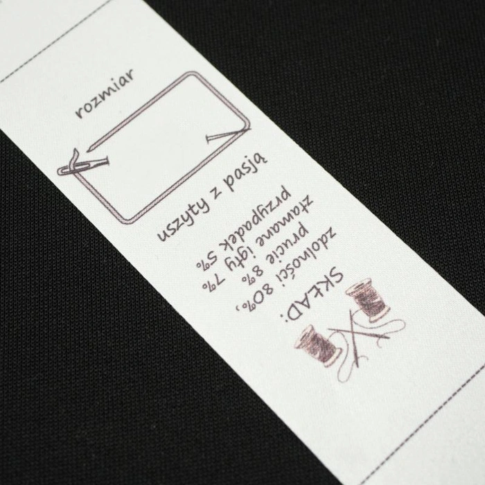 Ein gewebtes Etikett, das die Größe und eine originelle Beschreibung der Zusammensetzung enthält.