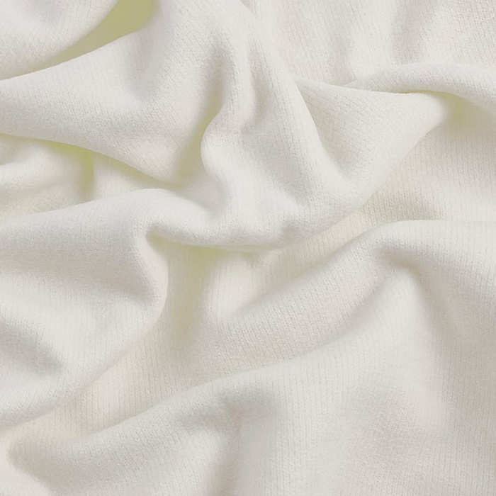 Zweiseitiger Strickstoff, der Komfort mit Eleganz verbindet. Eine Seite ist sanft angeschmirgelt – weich, mit leichtem Flaum und flauschiger Struktur. Die andere Seite hat eine sicht- und spürbare Rippenstruktur. Das Material ist leicht elastisch, griffig und sehr angenehm zur Haut.