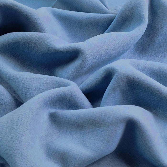 Zweiseitiger Strickstoff, der Komfort mit Eleganz verbindet. Eine Seite ist sanft angeschmirgelt – weich, mit leichtem Flaum und flauschiger Struktur. Die andere Seite hat eine sicht- und spürbare Rippenstruktur. Das Material ist leicht elastisch, griffig und sehr angenehm zur Haut.