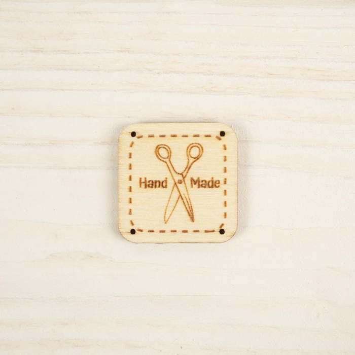 Holzanhänger mit einseitiger Aufschrift „HAND MADE“. Ausgestattet mit kleinen Löchern, perfekt zum Nähen. Wir empfehlen, sie nicht zu waschen.