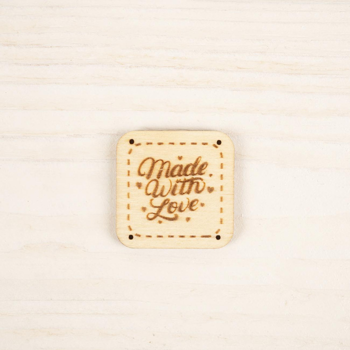 Holzanhänger mit einseitiger Aufschrift „MADE WITH LOVE“. Ausgestattet mit kleinen Löchern, perfekt zum Nähen. Wir empfehlen, sie nicht zu waschen.