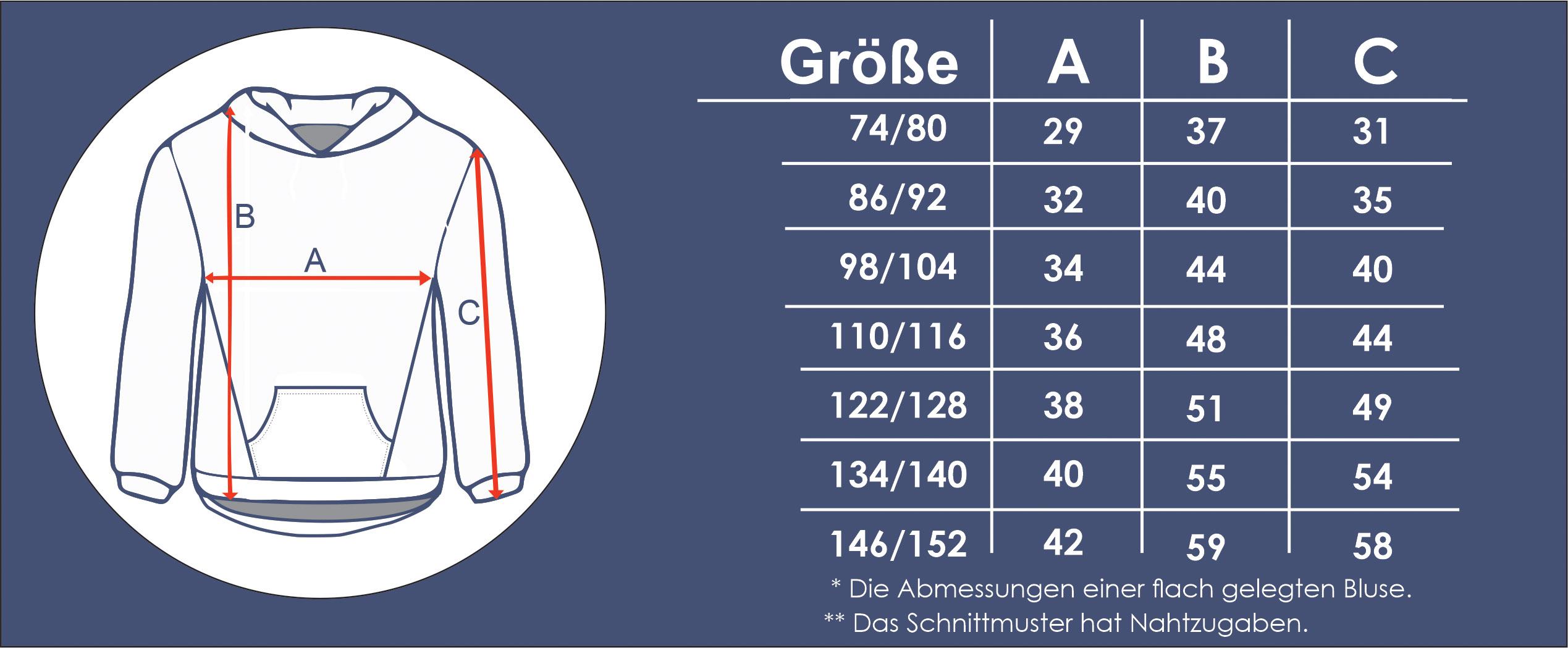 Die Größen entsprechen der Größentabelle unten, und die Nähanleitung ist in unserem Blog verfügbar.