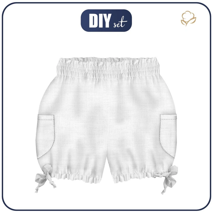 Das Set enthält das Material, das zum Nähen von Pumphosen für Kinder benötigt wird, sowie einen Papierausschnitt.