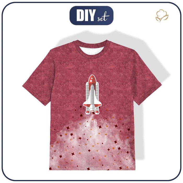 KINDER T-SHIRT- RAUMSCHIFF (WELTRAUMEXPEDITION) / ACID WASH DUNKELROT - Single Jersey (128/134)