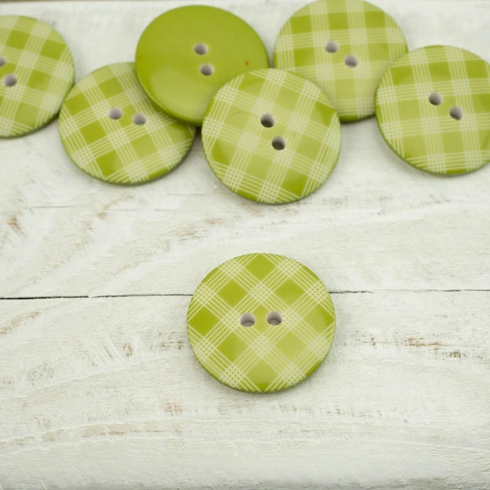 Dekorativer Knopf mit Karomuster und zwei Befestigungslöchern.