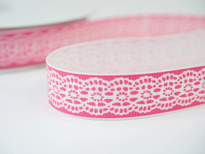 Eine Seite ist mit einem Motiv aus zarter weißer Spitze verziert. Dieses Band ist verschleiß- und reißfest, da es aus Polyester besteht.