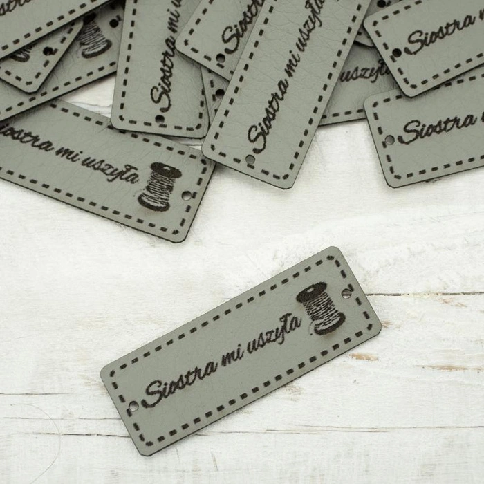 Eiförmige Applikation aus Öko-Leder mit dem Aufschrift "Siostra mi uszyła".