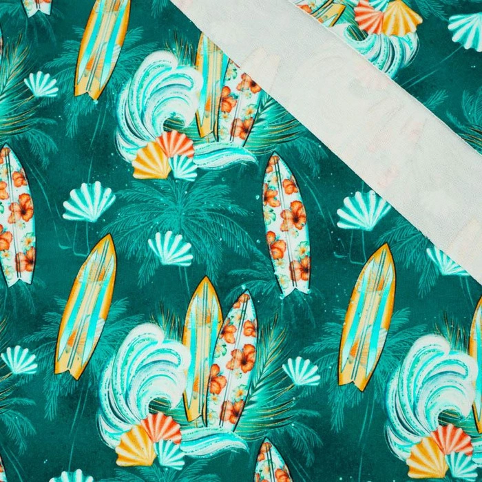 Der Stoff ist oben glatt und unten mit kleinen Schlaufen versehen (Schlingenoptik). Die Verwendung von Elastan in der Zusammensetzung macht den Stoff dehnbar.