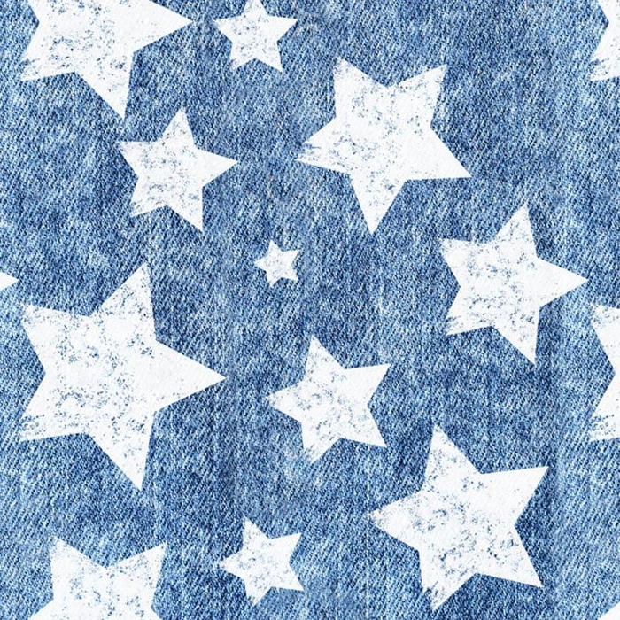 Weiße Sterne auf einem dunkelblauen Hintergrund von Vintage Look Jeans sind ein Motiv für aufstrebende Rockstars. Empfohlen für Blusen, Hosen, T-Shirts, Kleider, Röcke, aber auch Bekleidungszubehör.