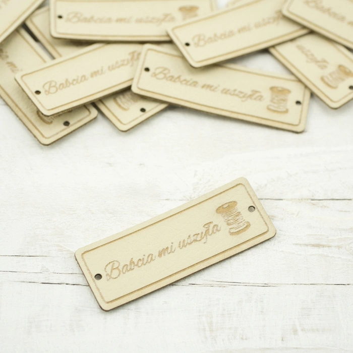 Decorative Cloting Label with sign "Babcia mi uszyła". The label is made of eco leather and has holes on sides for easy attachement.