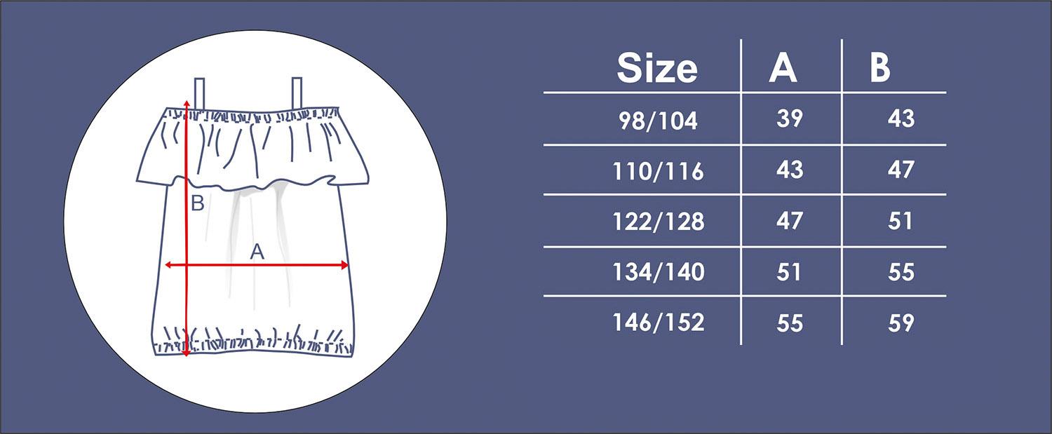 The bardot neckline blouse Sara is printed on a skin-friendly fabric with a slightly grainy texture. The fabric perfectly wraps the body and provides good air circulation, which makes it perfect for summer. In addition, it dries quickly and does not crease. The pattern also includes straps, which you can sew in a simple form, make strings for tying or omit this element when sewing - the decision is up to you. A charming ruffle adds a girlish charm to it.