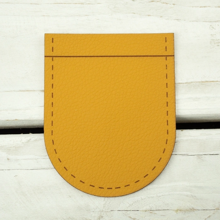 A pocket-shaped leatherette sew-on embossed with a dotted line along the edges to indicate the place where the material pockets are sewn on.