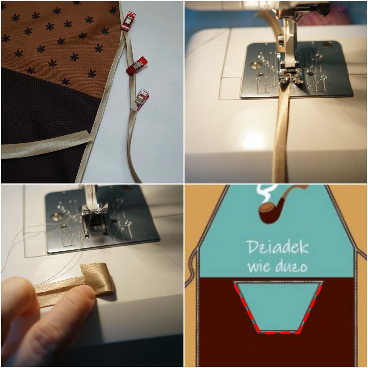 * składając lamówkę na pół, wsuwając brzeg fartuszka pomiędzy złożone połowy, spinamy i przyszywamy blisko brzegu lamówki (sposób dla bardziej doświadczonych w szyciu, ponieważ śliskie lamówki i równy szew mogą sprawiać spore problemy).