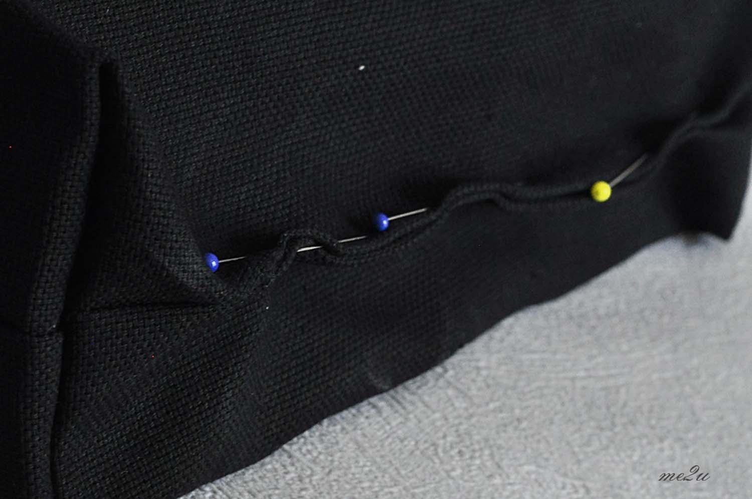 4. Przyszywamy zamek do naszego przodu i tyłu kosmetyczki. Na prawej stronie naszego przodu układamy prawą stronę taśmy suwakowej. Przypinamy szpilkami.