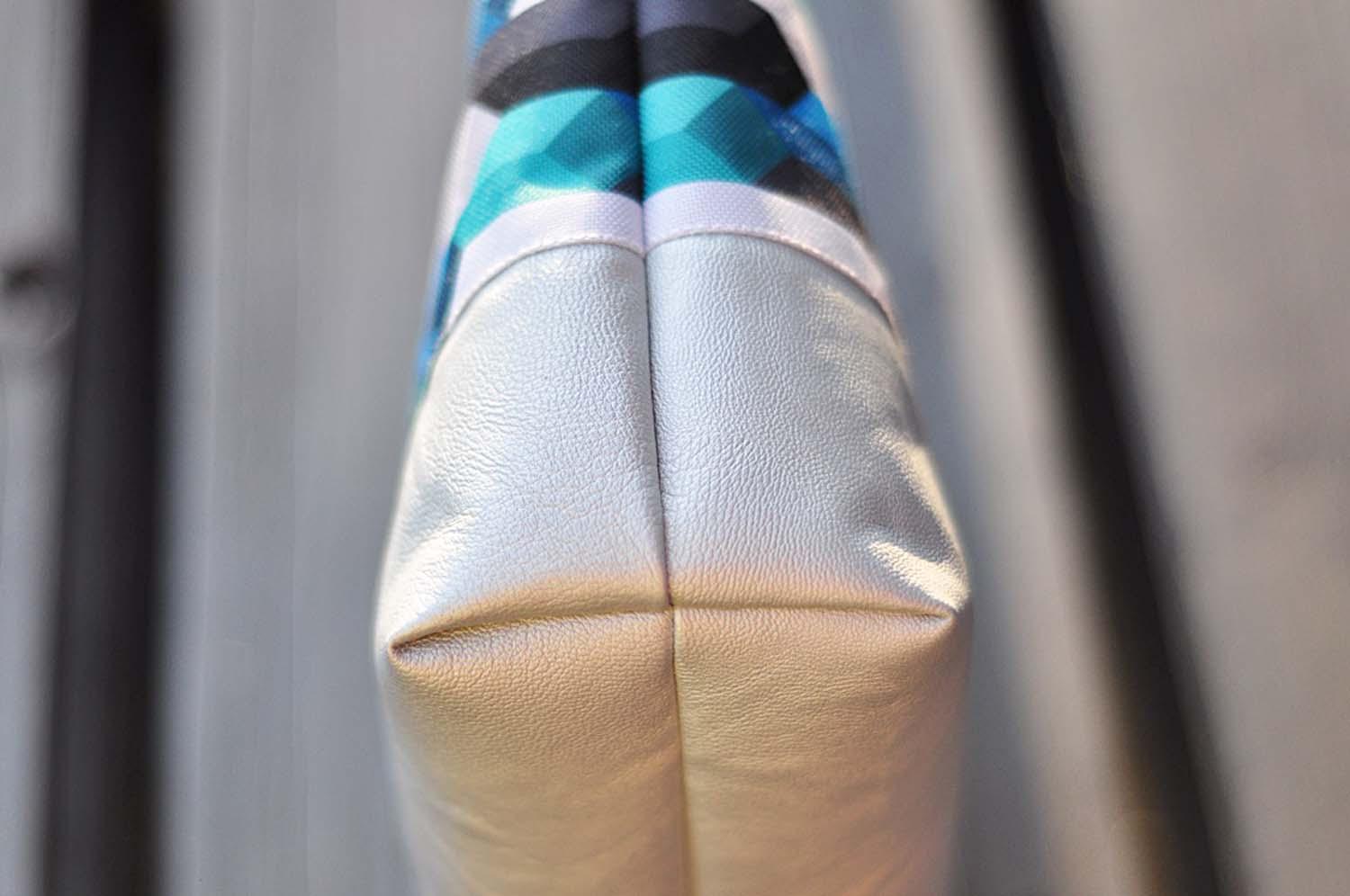 5. Układamy kosmetyczkę tak, aby przód i tył oraz dwie części podszewki były prawymi stronami do siebie. Zszywamy boki podszewki i kosmetyczki oraz spody, zostawiając w podszewce otwór na wywinięcie całości na prawą stronę.