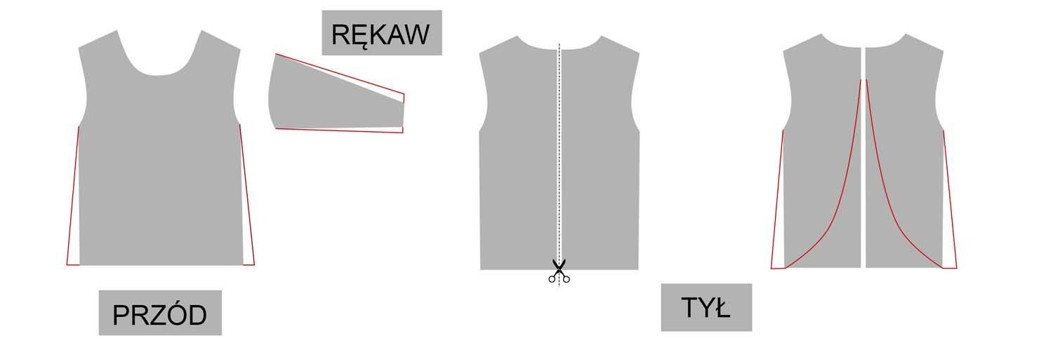 - rękawy zostały poszerzone w kierunku od gówki (robimy to, jeśli na wykroju rękawy są wąskie)