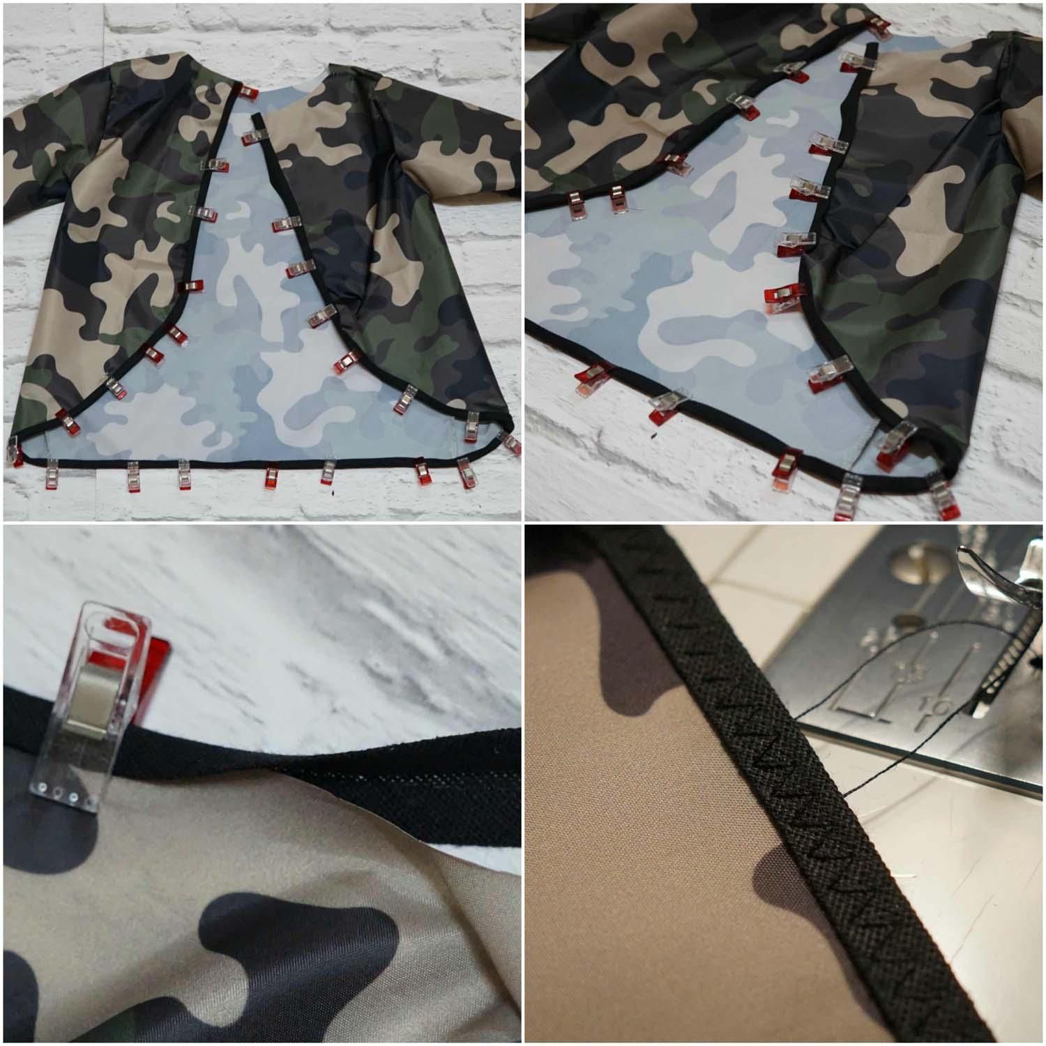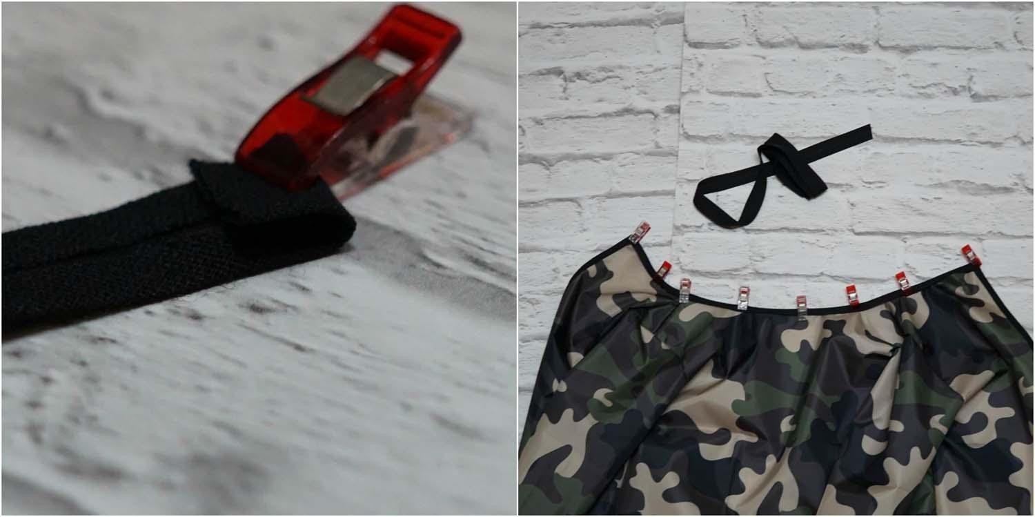 Składamy lamówkę na pół i wsuwamy w złożenie brzeg ortalionu, spinamy i przyszywamy ściegiem zgyzakowym.