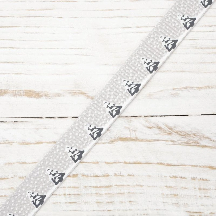 Grosgrain ribbon with a one-sided christmas motif of snowy trees.