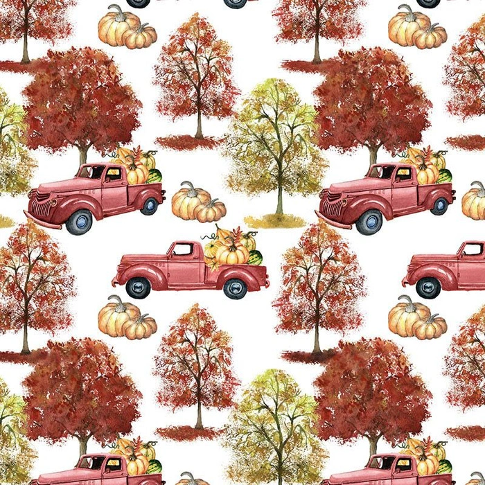 PUMPKINS ON THE PICKUP (trees) / white (PUMPKIN GARDEN) - Cotton woven fabric