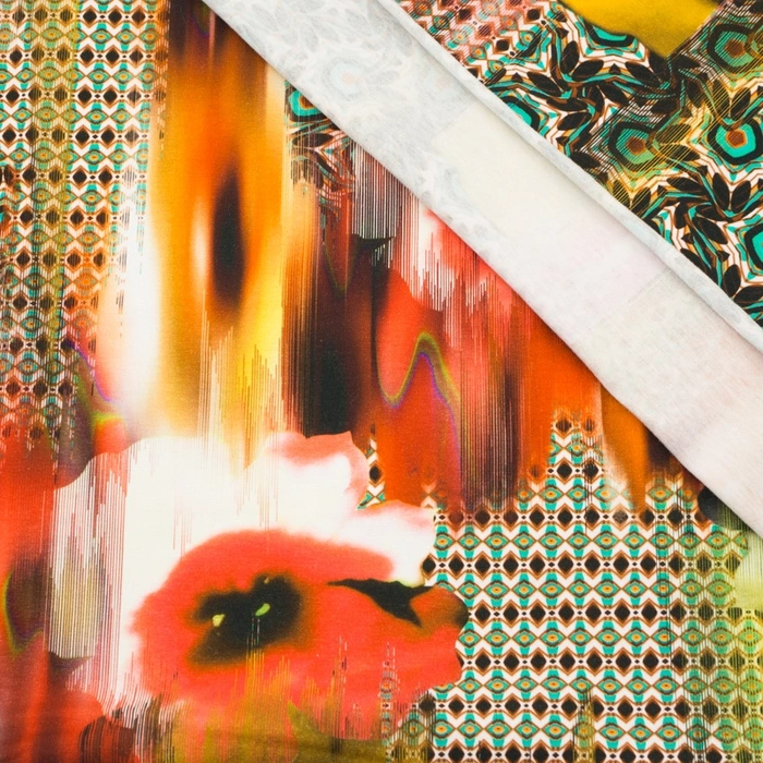 The use of elastane makes the fabric stretchy. The print on the fabric is produced by digital printing with the highest quality inks, in a full range of saturated colors and in the highest resolution. Thanks to these, the pattern is durable, abrasion resistant in use, the print does not crack and break when stretched, it has a high resistance to pilling.